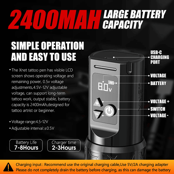 - Batería de Ultra Larga Duración: Con una impresionante capacidad de 2400 mAh, disfrutarás de 7 a 8 horas de trabajo continuo con una sola carga. El puerto de carga Tipo-C permite una recarga rápida en solo 2-3 horas, minimizando los tiempos de espera.
